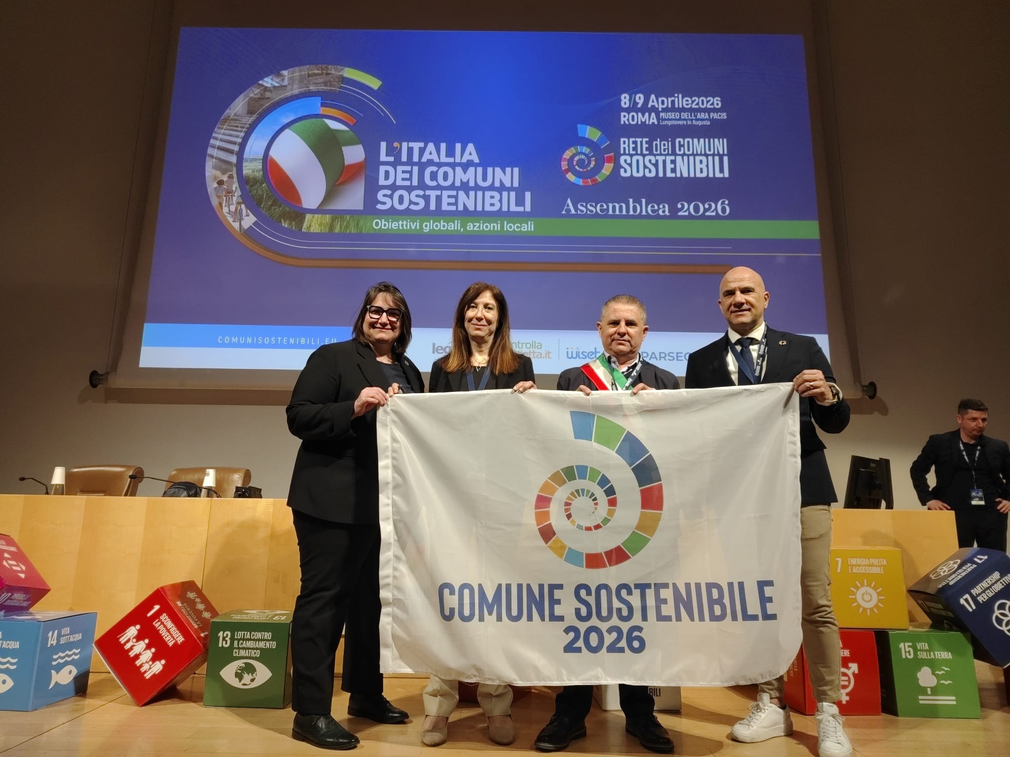 Questa mattina il Sindaco Giovanni Alberti e l'Assessore alla Sostenibilità Loredana Testini hanno ricevuto la bandiera Comune Sostenibile 2026 in occasione dell'Assemblea Nazionale della Rete dei Comuni Sostenibili.